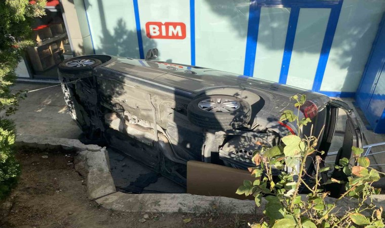 Yaşanan kaza, güvenlik kamerası tarafından kaydedildi. Görüntülerde aracın iş merkezi bahçesine düşme anı net bir şekilde görülebiliyor.