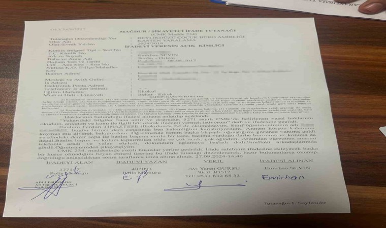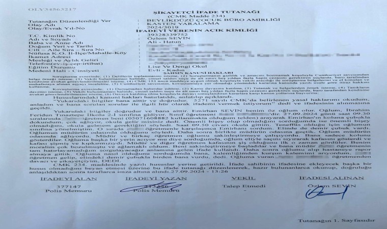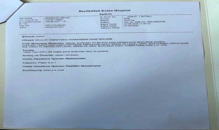 Hastaneye gidip rapor aldıklarını anlatan Sevin, "Adli rapor çıkartıldı. Kolunda bir yara, kırbaç gibi vurulmuş. Yanmış ve ödem toplamış, raporda da var. İşlem bittikten sonra karakolda çocuk şubeye gittik. Şikayetimizi yaptık" diye konuştu. Öğretmenin bunu yanlışlıkla yaptığını söylediğini kaydeden anne Sevin, "Bunu yanlışlıkla yapmışsa, oğluma vurmuşsa benim yanımda olması gerekmiyor muydu? Yaptığı hata, çocuğuma vurmuş. Kafasına aldığı darbe birazcık daha şiddetli olsaydı sonuç daha kötü olabilirdi. Bugün hastanedeyiz. Yarın okula gitmek zorunda, orada o öğretmen nasıl olacak? Çocuğumun canını nasıl onlara teslim edeceğim” dedi.