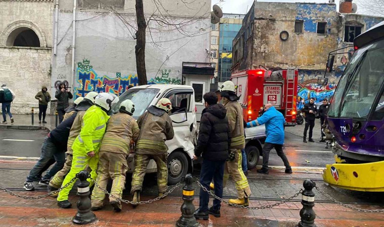 Beyoğlu’da tramvayın, tramvay yoluna giren kamyonete çarpması sonucu 1 kişi yaralandı. Tramvay seferleri 2 yönlü durduruldu.