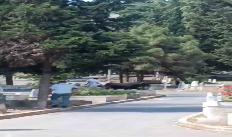 Kurban Bayramı’nın ilk gününde kesim için alana götürülmek istenen kurbanlık boğa, sahibinin elinden kaçtı. Dakikalarca kovalanan kurbanlık en sonunda Kulaksız Mezarlığı’na daldı. İçerideki çiçek satıcısı kadını ve mendil satan bir çocuğu yaralayan boğa ardından mezarın üstüne çıktı. Sahibinin ihbarı üzerine olay yerine belediye ekibi sevk edildi. İki kişinin yaralanması nedeniyle de gelen sağlık ekipleri, yaralıları ambulansla çevredeki hastaneye kaldırarak tedavi altına aldı. Polis ekipleri, belediye ekibi ve vatandaşlar ise kızgın boğayı zapt etmeye çalıştı. Ancak boğa bir türlü etkisiz hale getirilemeyince devreye belediye ekibi girdi.