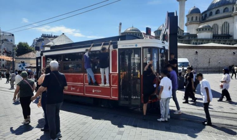 Beyoğlu İstiklal Caddesi’nde nostaljik tramvayın arkasına tutunan bir grup çocuk, tehlikeye aldırış etmeden yolculuk yaptı. Tramvayın arkasında ilerleyen çocuklar görenlerin yüreğini ağzına getirdi. Çocukların canlarını hiçe saydıkları anlar cep telefonu kamerasına yansıdı.