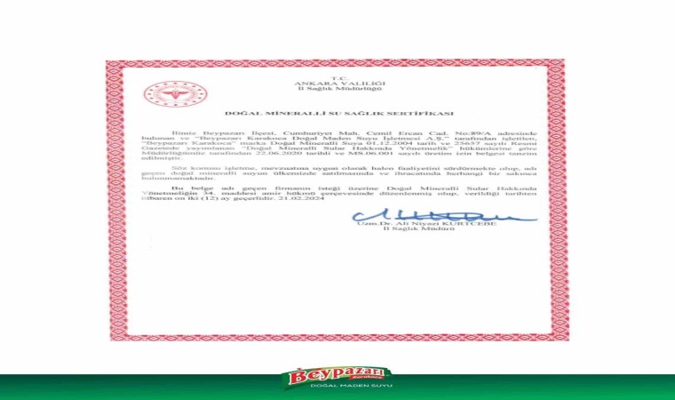 Konuya ilişkin yazılı açıklamada bulunan firma, "Bir kısım sosyal medya mecralarında İsviçre kaynaklı bir habere dayandırılarak markamız Beypazarı Doğal Maden Suyu hakkında haksız ve gerçek dışı dezenformasyon amaçlı yayınlar yapılarak ürün içeriğindeki bor miktarının yüksek olduğu ve sağlığa zararlı olduğu yönünde asılsız itham ve içerikler paylaşılmıştır. Bu tür kötü niyetli ve haksız ithamlar ile ilgili tüketicilerimizi aydınlatmak ve doğru bilgileri aktarmak isteriz. Ülkemizin yüzde 100 yerli ve milli değeri olan ‘BEYPAZARI’ markası uluslararası arenada hızla büyümektedir. Firma olarak 30’u geçkin ülkeye ihracat yaparak Türkiye, Avrupa ve Dünya kalite ödülleri almış, ISO 22000; ISO 9001; ISO 14001; ISO 45001; FSSC 22000 ve ESMA kalite sertifikalarına sahip olan ve sektörde saygın bir yere sahip olan bir markayız. Şirketimiz ürünlerinin kalitesini sürekli olarak titizlikle izlemekte, yine ürünlerimiz Sağlık Bakanlığı tarafından da denetlenerek düzenli olarak analizleri yapılmaktadır" ifadelerine yer verdi.