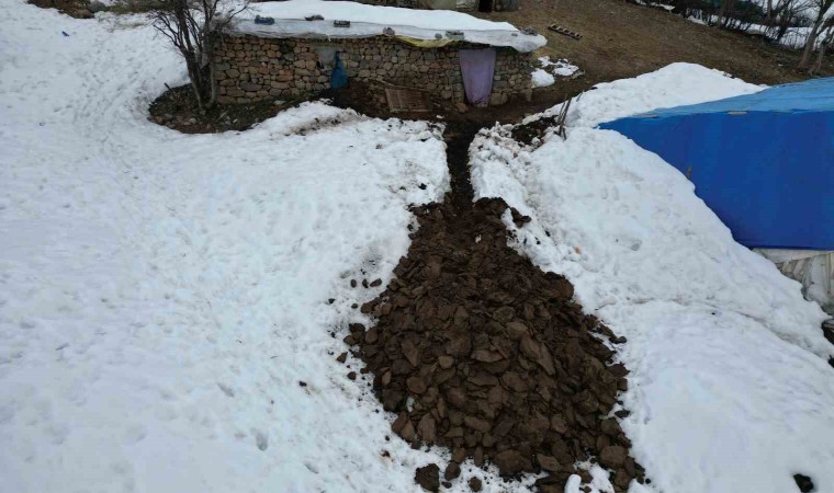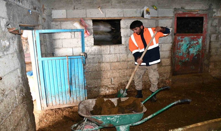 Sabahın ilk ışıklarıyla hayvanların içine girerek yemlerini verip dışarı çıkaran köylüler, buz gibi havada kürek ve el arabalarıyla ahırları temizliyor.