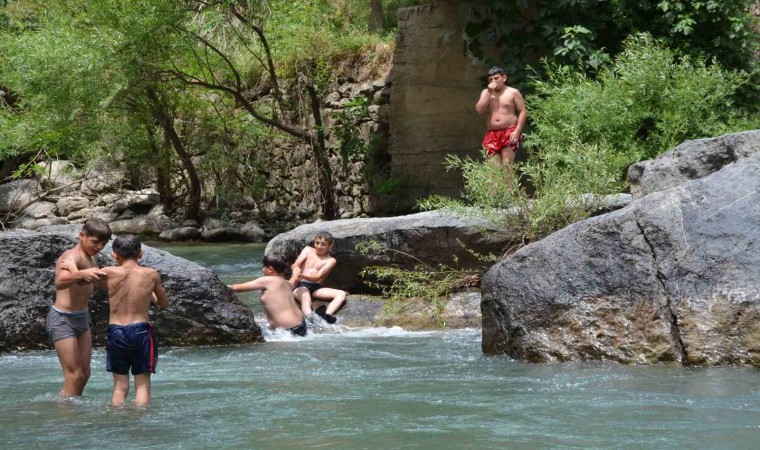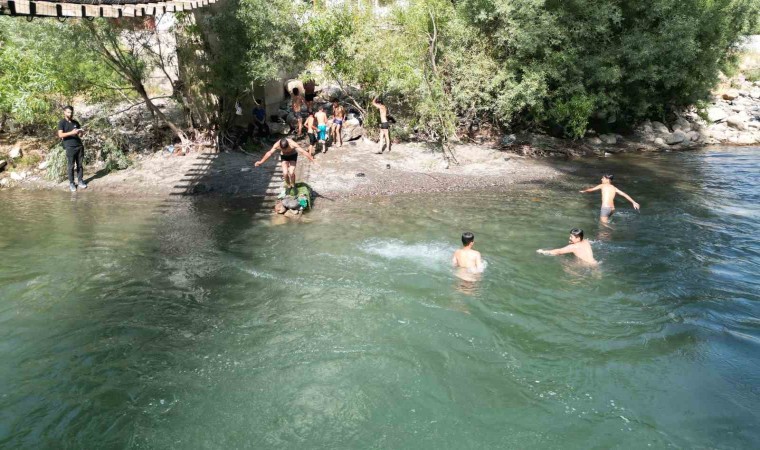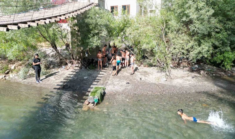Şırnak’ın Beytüşşebap ilçesinde sıcak havaların etkisiyle çocuklar, kar sularından beslenen çayda yüzerek serinliyor.