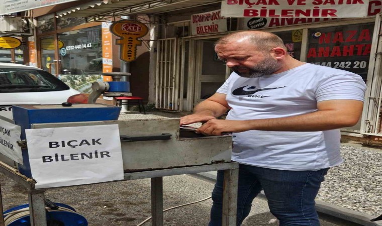 Aydın’ın Efeler ilçesinde kurban hazırlıklarını yapan birçok vatandaş bıçak bileme işlemlerini son günlere bırakınca, bıçak bileme ustalarının da ‘bayram’ mesaisi yoğun geçmeye başladı. Siparişleri yetiştirmek için arefe günü gece saatlerine kadar çalışacaklarını belirten bıçak bileme ustası Tarık Avcu; “Son gün yoğunluğumuz var” dedi.