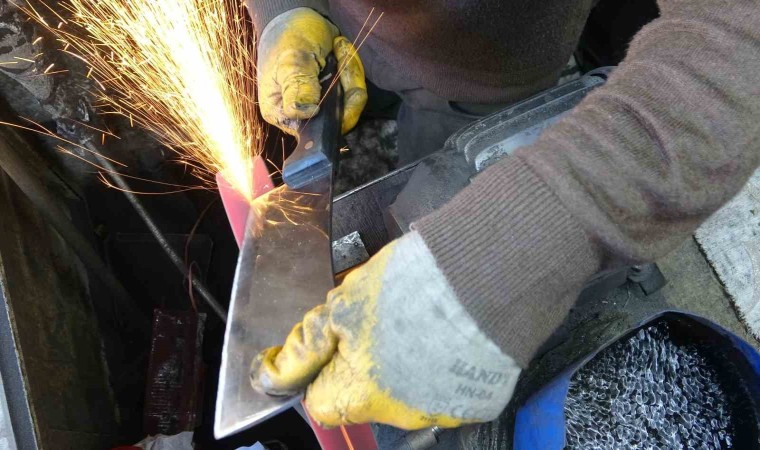 Van’da dededen kalma bıçak bileme mesleğini sürdüren Mehmet Şakir Cengiz, Kurban Bayram mesaisi yapıyor.