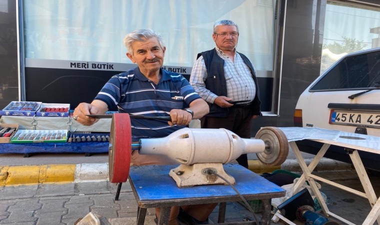 Manisa’nın Alaşehir ilçesinde 31 yıllık bıçak ustası olan Mustafa Sargın, her yıl tezgah kurduğu Murat Tosun Caddesi’ndeki yerinde müşterilerine hizmet vermeye devam ediyor. Hayat şartlarının ağırlaşmasına rağmen bıçak bileme fiyatlarına zam yapmayan Mustafa Sargın’ın tezgahı önünde zaman zaman kuyruklar oluşuyor.