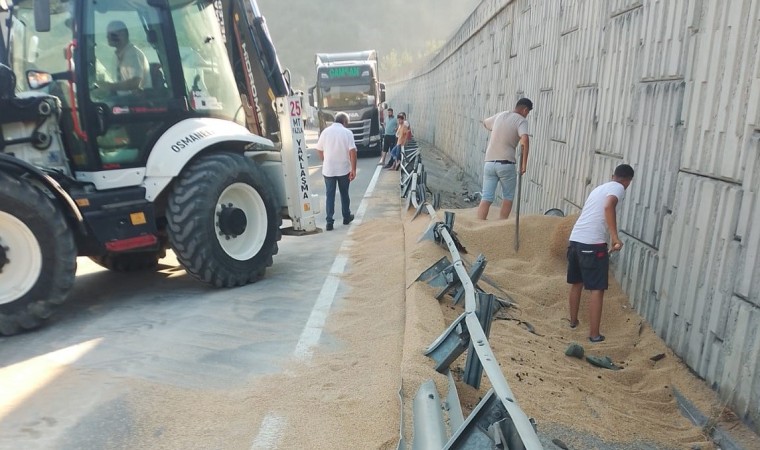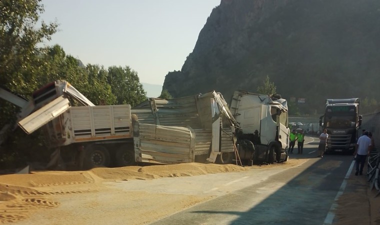 Bilecik’te seyir halinde kontrolden çıkan buğday yüklü tır 3 metre yükseklikten alt yola devrildi.