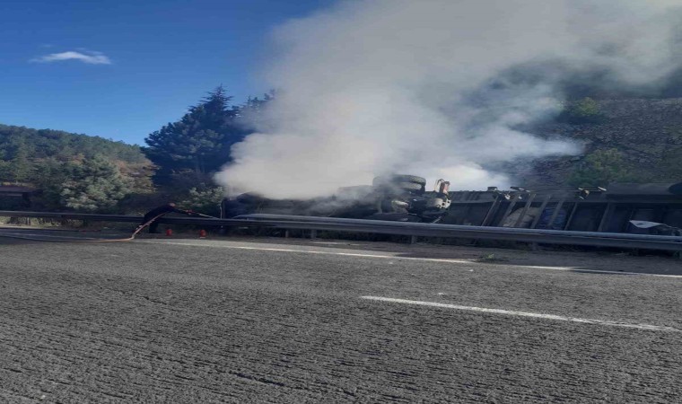 Bilecik’in Bozüyük ilçesi girişinde yoldan çıkan sunta yüklü tır devrildi. Alev alan araçtaki sürücü kazayı hafif yaralı olarak atlattı.