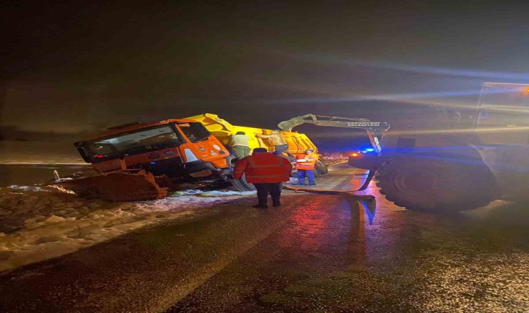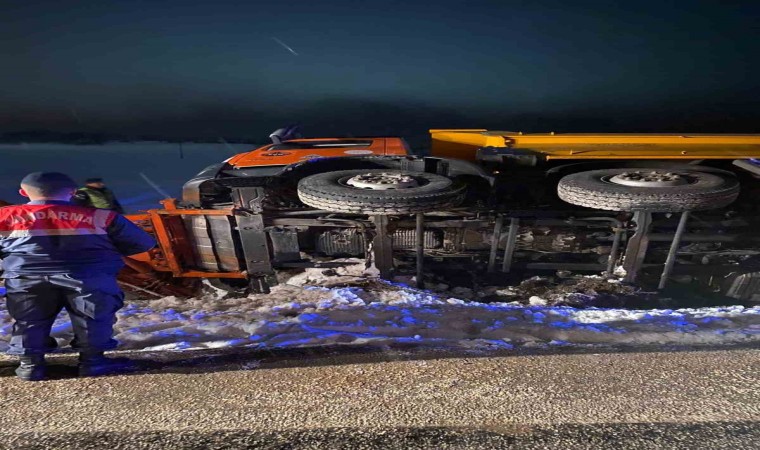 Bilecik’in Pazaryeri ilçesinde karayolunda kar kürüme ve tuzlama yapan kamyon devrildi.