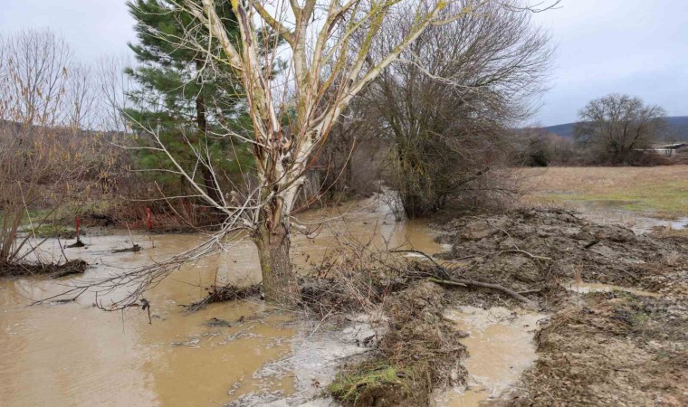 Bilecik ve ilçelerinde dün şiddetli yağan yağmur sonrası Karasu Deresi taşarken birçok tarım arazisi ve iki ev su altında kaldı.