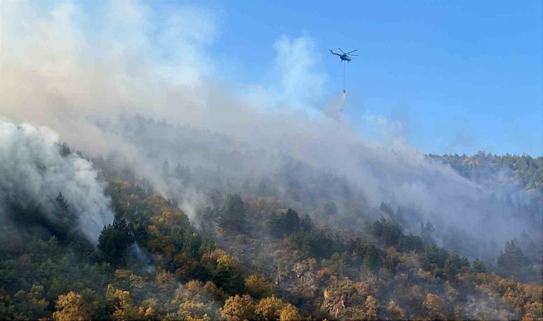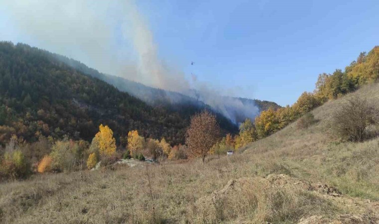 Bilecik merkeze bağlı Kurtköy ile Ahmetpınar köyleri arasında bir mevkide çıkan orman yangınını söndürmek için ekipler karadan ve havadan müdahale ediyor.