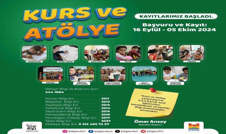 Zeytinburnu Bilgi Evleri’nde kurs ve atölye çalışmaları için kayıtlar başladı. 5 Ekim 2024 tarihine kadar devam edecek öğrenci kayıtları için başvurular Zeytinburnu’ndaki Bilgi Evi şubelerinden yapılabiliyor.
