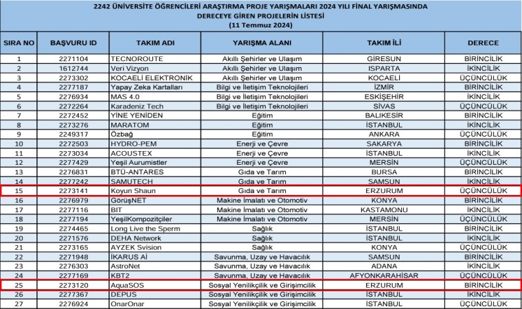 Atatürk Üniversitesi Bilgisayar Mühendisliği Bölümü öğretim üyesi Doç. Dr. Deniz Dal danışmanlığında Bilgisayar Mühendisliği Bölümü öğrencileri tarafından lisans bitirme projesi olarak hazırlanan 4 projenin 3’ü söz konusu 90 proje arasına girme başarısını göstermişti. Yarışmanın 11 Temmuz 2024 tarihinde çevrim içi olarak gerçekleştirilen final değerlendirmeleri sonucu 9 alandan 27 proje Birincilik, İkincilik ve Üçüncülük ödüllerine layık görüldü. Atatürk Üniversitesi Bilgisayar Mühendisliği Bölümü öğrencileri tarafından hazırlanan ve finale kalan üç projeden ikisi, jürinin takdirini kazanarak Türkiye derecesi elde etmeyi başardı.