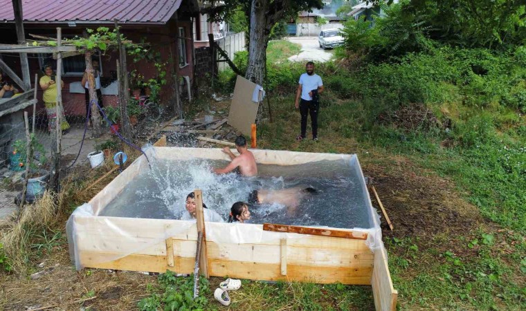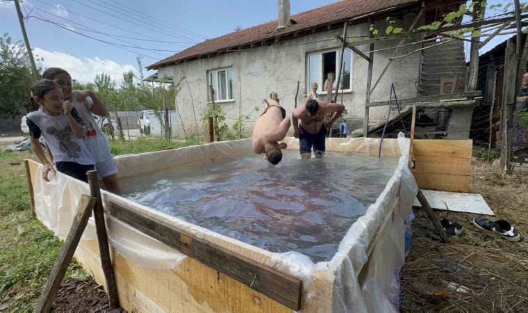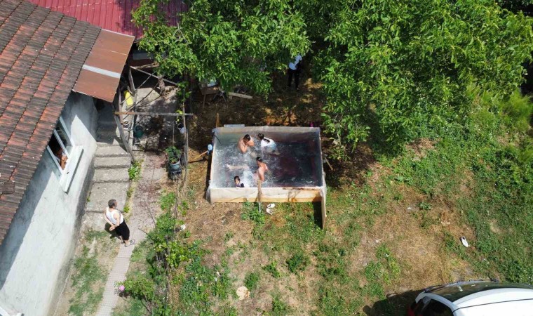 Düzce’de hava sıcaklıkları mevsim normallerinin üzerinde seyredince, serinlemek isteyen mahalle sakinleri bahçeye bin 500 liraya 4 kişilik havuz yaptı.