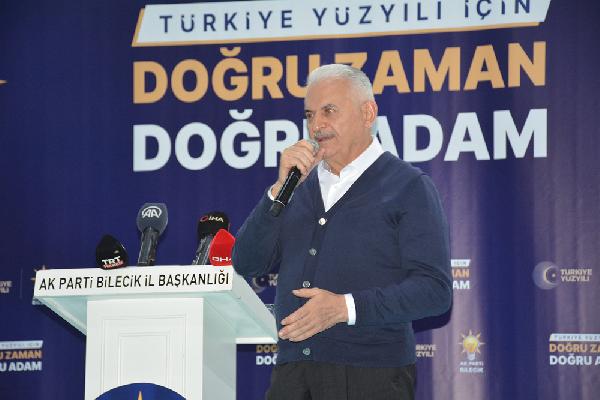 AK Parti Genel Başkanvekili Binali Yıldırım, Bilecik Ertuğrulgazi Atatürk Spor Salonu’nda partililerle bir araya geldi. 14 Mayıs’ta yapılacak olan milletvekilliği ve cumhurbaşkanlığı seçiminin çok önemli olduğunu ifade eden Yıldırım, “Burası cihan imparatorluğunun doğduğu yerdir. Bu toprakların üzerinde 14 Mayıs seçimlerinde ciddi bir durumla karşı karşıyayız. Biz 15 seçimi geride bıraktık. Bu seçim diğer seçimlere benzemiyor. Peki bu seçim diğerlerinden ayıran nedir? Çok basit. Bu seçimde ilk defa karşımızdaki ittifak adayını FETÖ'cüler, PKK, HDP destekliyor ve onların arkasındaki ağa babaları destekliyor. Bir Cumhurbaşkanlığı bir de vekiller için sandık gelecek. Biz bu seçimde AK Parti, Milliyetçi Hareket Partisi, Yeniden Refah Partisi, Büyük Birlik Partisi olarak sandığa gidiyoruz. Dolayısıyla mecliste Cumhurbaşkanımıza güçlü bir milletvekili desteği lazım değil mi? Cumhurbaşkanımızı seçeceğiz ve vekillerimizi de meclise göndereceğiz. Çünkü güçlü hükümet güçlü meclisle olabilir. Bu seçim ilk defa PKK/ PYD/ YPG, FETÖ terör örgütü ve onların sahiplerinin meşrulaştırılmaya çalışıldığı bir seçimdir. Sandığa terör örgütlerini getiriyorlar. Ne diyorlar; ‘Tayyip Erdoğan gitsin de ne olursa olsun’ Özerklik getirecekler, bölünme getirecekler. Ülkemizin güney sınırlarında bir terör devleti kurmak için yıllardır gayret gösteriyorlar. Terör örgütlerine destek veriyorlar. Ancak onların hesap edemediği bir şey var. Yüzyıl önce küllerinden doğan, ‘Hattı müdafaa yoktur, sathı müdafaa vardır, o satıh bütün vatandır’ diyerek bir milleti İstiklal mücadelesine sevk eden Mustafa Kemal Atatürk'ün ve onun silah arkadaşlarının emanet ettiği bu toprakları bölücülere FETÖ'cülere bu millet bırakır mı? Burası Osmanlı'nın kurulduğu yer, buna izin verir mi? Ay yıldızlı bayrağı indirir mi? Ezanları dindirir mi?” dedi.