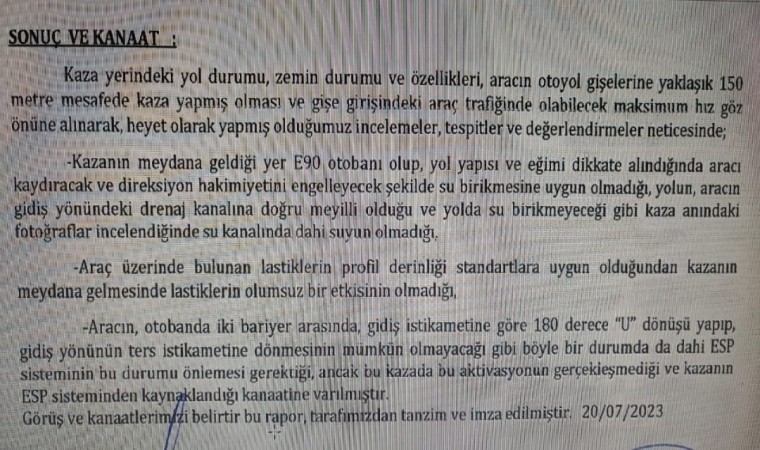 “Kaza yerindeki yol durumu, zemin durumu ve özellikleri, aracın otoyol gişelerine yaklaşık 150 metre mesafede kaza yapmış olması ve gişe girişindeki araç trafiğinde olabilecek maksimum hız göz önüne alınarak, heyet olarak yapmış olduğumuz incelemeler, tespitler ve değerlendirmeler neticesinde, kazanın meydana geldiği yer E90 otobanı olup, yol yapısı ve eğimi dikkate alındığında aracı kaydıracak ve direksiyon hakimiyetini engelleyecek şekilde su birikmesine uygun olmadığı, yolun, aracın gidiş yönündeki drenaj kanalına doğru meyilli olduğu ve yolda su birikmeyeceği gibi kaza anındaki fotoğraflar incelendiğinde su kanalında dahi suyun olmadığı, araç üzerinde bulunan lastiklerin profil derinliği standartlara uygun olduğundan kazanın meydana gelmesinde lastiklerin olumsuz bir etkisinin olmadığı, aracın, otobanda iki bariyer arasında, gidiş istikametine göre 180 derece "U" dönüşü yapıp, gidiş yönünün ters istikametine dönmesinin mümkün olmayacağı gibi böyle bir durumda da dahi ESP sisteminin bu durumu önlemesi gerektiği, ancak bu kazada bu aktivasyonun gerçekleşmediği ve kazanın ESP sisteminden kaynaklandığı kanaatine varılmıştır.”