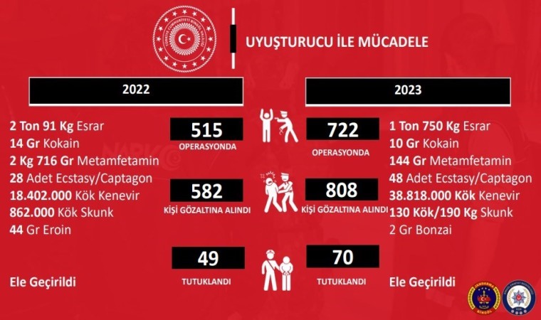 Güvenlik güçlerinin uyuşturucu tacirlerine göz açtırmadığının altını çizen Vali Usta, “2023 yılında 722 operasyon gerçekleştirdik. Bu operasyonlarda, 808 kişi gözaltına alındı ve 70 kişi tutuklandı. Yine operasyonların verilerine baktığımızda 1 ton 750 kilo esrar, 10 gram kokain, 144 gram metamfetamin, 48 Ecstasy/Captagon, 38 milyon 818 bin kök kenevir, 130 kök Skunk ele geçirdik” diye konuştu.