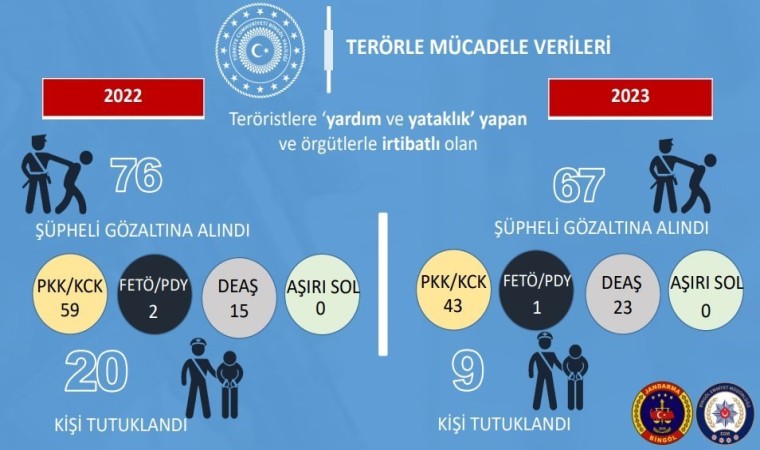 Bingöl Valisi Ahmet Hamdi Usta, Karşılaştırmalı Asayiş ve Güvenlik Konulu Basın Toplantısı düzenlendi. Valilik binasında gerçekleşen toplantıya İl Jandarma Komutanı Bilgihan Yeşilyurt, İl Emniyet Müdürü Şükrü Orhan, vali yardımcıları, kaymakamlar ve basın mensupları katıldı. 2022 ve 2023 yılı Karşılaştırmalı Asayiş ve Güvenlik Konulu bir sunum gerçekleştiren Vali Usta, göreve başladığı son aylık faaliyetleri de açıkladı. Vali Usta, “Valiliğimiz koordinesinde yürütülen iç güvenlik operasyonları çerçevesinde 2022 yılında 35 şehir operasyonu, 2 bin 257 kırsal, 2023 yılında 31 şehir operasyonu, 3 bin 773 kırsal operasyon gerçekleştirildi. Terörle mücadele verilerine baktığımızda 2022 yılında 5 kişinin teslim olduğunu, 2023 yılında ise sağ/yaralı 5 kişinin ele geçirildiğini görüyoruz. Yine teröristlere yardım ve yataklık yapan, örgütlerle irtibatlı olan kişilere yönelik 2022 yılında 20 kişi tutuklanırken, 2023 yılında 9 kişi tutuklandı. Terörle mücadelede yapılan operasyonlarda 2022 yılında 18 adet mayın, 389 kilo patlayıcı madde, 318 adet muhtelif mühimmat, 6 adet silah ve 1 adet el bombası geçirildi. Bu rakam 2023 yılında ise 9 adet mayın, 180 kilo patlayıcı madde, 487 adet muhtelif mühimmat, 9 adet silah ve 1 adet el bombası ele geçirildi” dedi.