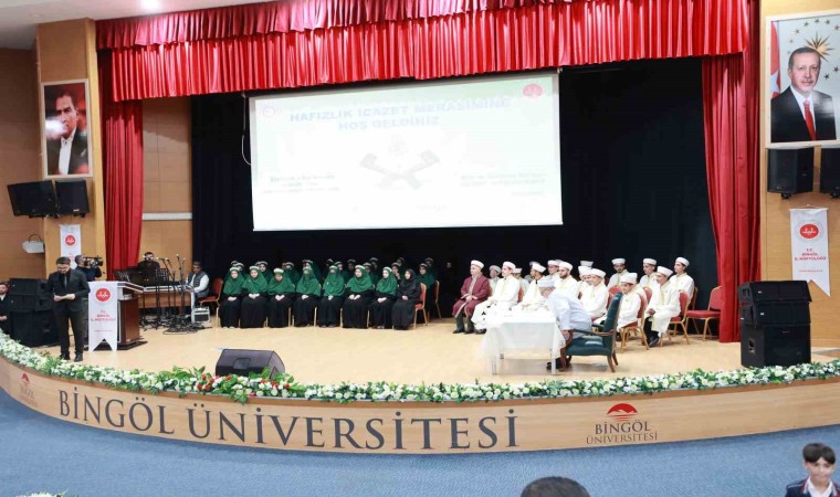 Bingöl İl Müftülüğüne bağlı Kur’an kurslarında hafızlığını tamamlayan 44 öğrenci için Bingöl Üniversitesi Recep Tayyip Erdoğan Kongre Merkezi’nde Hafızlık İcazet Merasimi düzenledi. Saygı duruşu ve İstiklal Marşı’nın okunması ile başlayan program Kur’an-ı Kerim tilaveti, dualar ve ilahi dinletisi ile devam etti. Programa, Vali Ahmet Hamdi Usta, Diyanet İşleri Başkanlığı Eğitim Hizmetleri Genel Müdürü Sedide Akbulut, Bingöl Belediye Başkanı Erdal Arıkan, İl Jandarma Komutanı Tuğgeneral Bilgihan Yeşiyurt, Bingöl Üniversitesi Rektörü Prof. Dr. Erdal Çelik, İl Müftüsü Celal Sürgeç, Şeyh’ül Kurra Talip Akbal, kurum müdürleri, vatandaşlar, hafızlar ve aileleri katıldı.