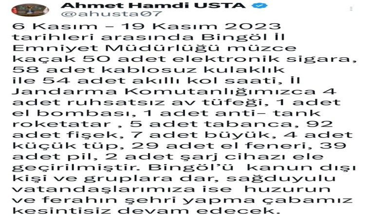 Bingöl Valisi Ahmet Hamdi Usta sosyal medya hesabından yaptığı açıklamada, “6 Kasım - 19 Kasım 2023 tarihleri arasında Bingöl İl Emniyet Müdürlüğümüzce kaçak 50 adet elektronik sigara, 58 adet kablosuz kulaklık ile 54 adet akıllı kol saati, İl Jandarma Komutanlığımızca 4 adet ruhsatsız av tüfeği, 1 adet el bombası, 1 adet anti- tank roketatar, 5 adet tabanca, 92 adet fişek, 7 adet büyük tüp, 4 adet küçük tüp, 29 adet el feneri, 39 adet pil, 2 adet şarj cihazı ele geçirilmiştir. Bingöl’ü kanun dışı kişi ve gruplara dar, sağduyulu vatandaşlarımıza ise huzurun ve ferahın şehri yapma çabamız kesintisiz devam edecek” dedi.