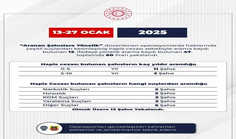 Polis ve jandarma ekipleri tarafından son 2 haftada aranan şahıslara yönelik düzenlenen operasyonlarda, haklarında çeşitli suçlardan kesinleşmiş hapis cezası sebebiyle arama kaydı bulunan 13, ifadeye yönelik arama kaydı bulunan 47 olmak üzere toplam 60 kişi yakalandı. Genel güvenlik ve asayişin sağlanması ve suç işlenmesinin önlenmesi amacıyla yapılan çalışmalarda 5 gram kokain, 225.33 gram esrar maddesi, 1 gram metamfetamin, 3 adet uyuşturucu kullanım aparatı ele geçirildi. Yapılan operasyonlarda 16 kişi gözaltına alındı.