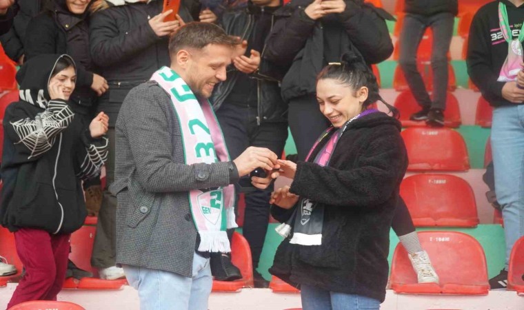 Isparta Atatürk Stadı’nda oynanan maçın devre arasında binlerce kişinin içinde Isparta 32 Spor’un taraftar grubu 32 Gençlik üyelerinden Onur Yaşar Angun, kız arkadaşı Zeliha İldeş’e evlilik teklifi etti. Dev pankartla “Benimle evlenir misin güzel kızım” diyerek kız arkadaşına evlenme teklifi yapan Angun ve kız arkadaşı Zeliha İldeş’i tüm taraftarlar tebrik ederek ayakta alkışladı. Evet cevabı alan genç taraftar, konfeti ve meşale eşliğinde yüzük ve çiçek takdim etti.