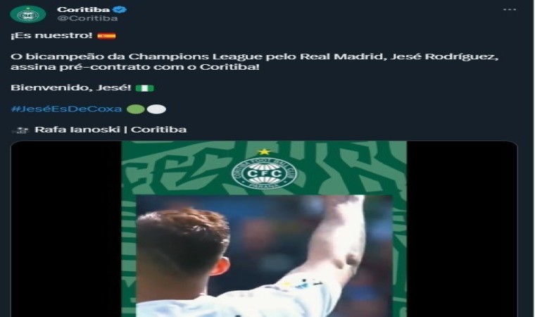 Brezilya Ligi ekiplerinden Coritiba, kadrosuna Avrupa’dan kariyerli bir oyuncuyu kattı. Real Madrid ile 2 kez UEFA Şampiyonlar Ligi şampiyonluğu yaşayan 30 yaşındaki oyuncu Jese Rodriguez ile anlaşma sağlandı. Coritiba’nin sosyal medya hesabından yapılan paylaşımda, Jese Rodriguez ile ön sözleşme imzalandığı duyuruldu.