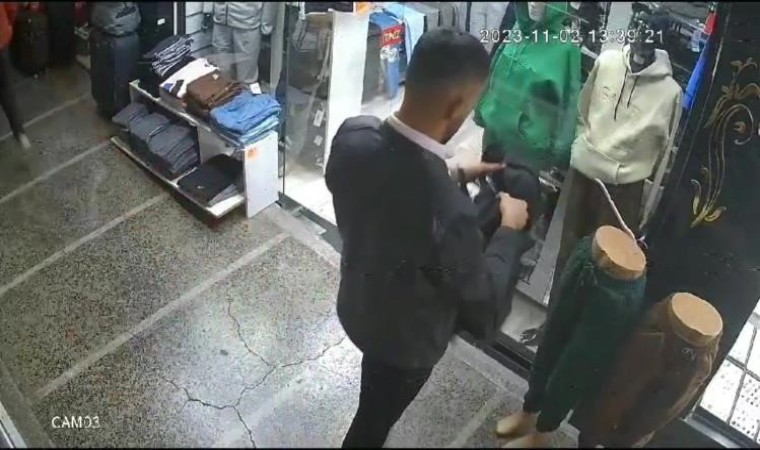 Karabük’te bir giyim mağazasına gelen 2 kişiden biri mağaza çalışanını oyalarken, diğerinin de swet ve mont çaldığı anlar güvenlik kamerasına yansıdı.