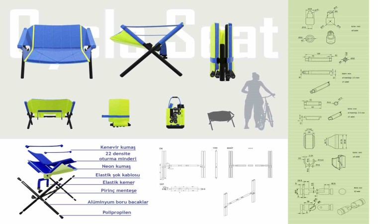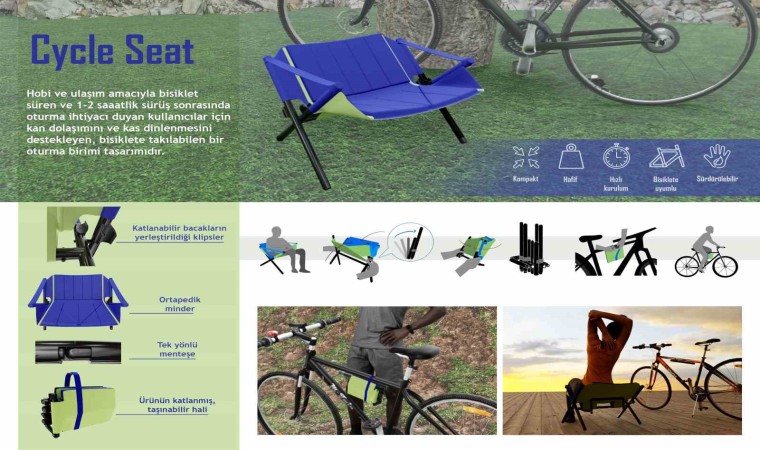 Sürücüler için kan dolaşımını ve kas dinlenmesini destekleyen, bisiklete takılabilen katlanabilir bir oturma birimi tasarımı olan Cycle Seat, kullanılmadığında kolayca katlanabilen ve az yer kaplayan tasarımıyla dikkat çekiyor. Şehir içi bisikletlerin gövdesine uyumlu bir şekilde tasarlanan mobilya, elastik kemeri sayesinde bisiklete sabitlenebiliyor. Danışmanlığını Dr.Öğr.Üyesi Sevi Merter, Burçin Özkır Aşıcı ve Nermin Sena Özger’in yaptığı projeyi tasarlayan öğrenciler şunları söyledi: “Şehir içinde; deniz kenarı, park, orman gibi tur güzergahlarını kullanan bisiklet sürücüleri, 1-2 saatlik sürüş sonrasında oturma ihtiyacı duyuyor. Kullanıcının bulunduğu ortamda oturma birimi bulunmaması, bulunsa da temiz ve ergonomik olmaması sebebiyle bu tür sürücülerin dinlenme ihtiyacı uygun şekilde karşılanamıyor. Bu ihtiyaçtan yola çıkarak bir tasarım yaptık. Göztepe ve Bostanlı sahilinde denemeler yaptık. Oralarda farklı bisiklet türlerini kullanan kişilerle görüştük. Şehir içi bisikletine yönelmeye karar verdik. Yarışmada taşınabilirlik teması olduğu için buna yönelik tasarladık. Ürünün prototipini sanayi ortamında yaptırıp görme şansımız oldu. Araştırma ve analizlerimizi detaylı ve uzun soluklu yaptık. İyi bir problemimiz ve iyi bir çözümümüz vardı, bizi yarışmada farklı kılan da buydu.”