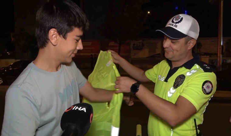 Kırıkkale’de polis ekipleri, bisiklet ve motosiklet sürücülerinin karıştığı kazaları azaltmak için gece fark edilmeyi sağlayan reflektif yelek dağıttı.