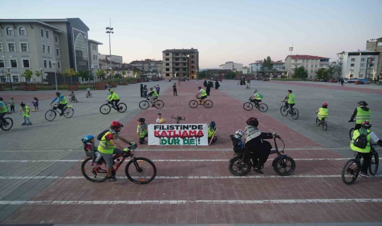 Dernek üyelerinden Rabia Yıldız ise, “Bu gün Dünya Bisiklet Günü bizde burada Filistin için bir araya geldik. İsrailliler 7 Ekimden bu yana Filistin’de ki insanlara yapmadıklarını bırakmadılar. Evlerinden ettiler, yurtlarından ettiler. Bütün insanları soykırımla beraber yok ediyorlar. Bizde bu katliama karşı bir anne olarak bende buradayım. Biz kesinlikle bu soykırımı lanetliyoruz” şeklinde konuştu.