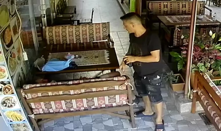 Bisikleti ile Bursa’dan Alanya’ya giden 18 yaşındaki genç bir kafede dinlenirken kimliği belirsiz bir kişi tarafından cep telefonu çalındı. O anlar güvenlik kamerasına yansıdı.