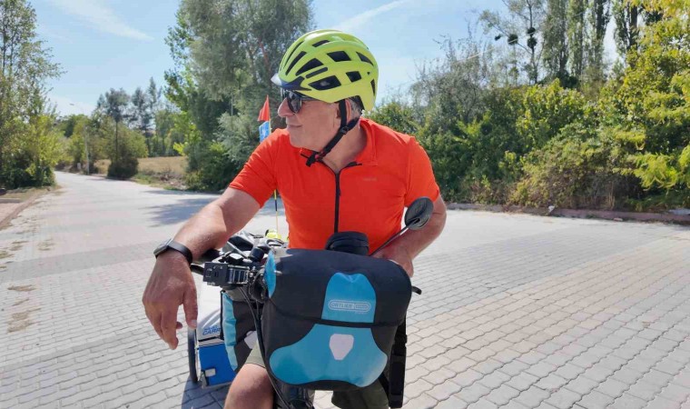 Bisikletiyle başladığı geziyle barışı dünyaya yaymayı hedeflediğini belirten gezgin Metin Sert, Kütahya’nın Domaniç ilçesine geldi.