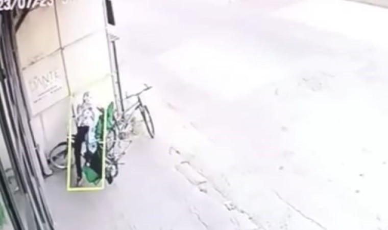 İş yerinin önüne bisikletle gelen ve yüzünü kapüşonla kapatan şüpheli, park halindeki bisikleti de alarak kayıplara karıştı. O anlar iş yerinin güvenlik kamerasına saniye saniye yansıdı.