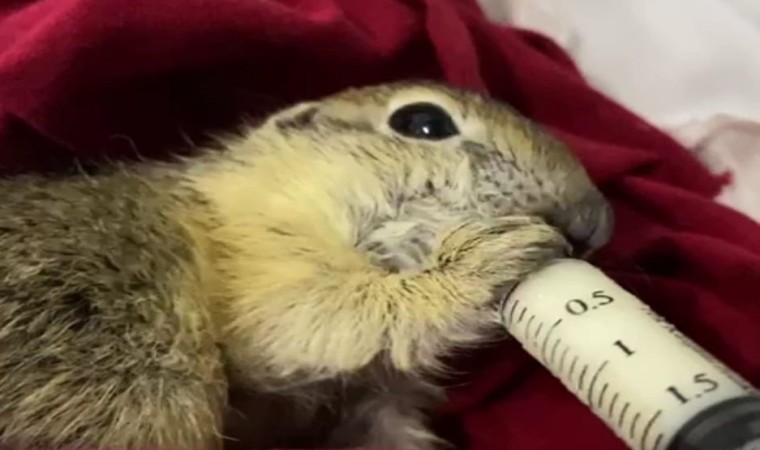 Erzurum’da vatandaşlar tarafından bitkin halde bulunan yavru Anadolu yer sincabı, Doğa Koruma ve Milli Parklar Genel Müdürlüğü 13. Bölge Müdürlüğü’nde şırıngayla besleniyor. Yavru sincap, rehabilitasyon sürecinden sonra doğaya bırakılacak.