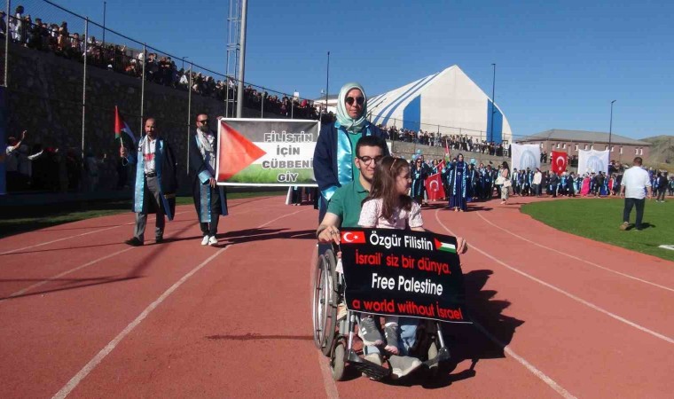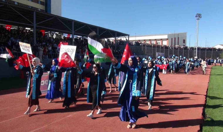 Rahva yerleşkesindeki stadyumda düzenlenen program saygı duruşu ve istiklal marşının okunmasının ardından kortej yürüyüşü yapan öğrenciler Türk ve Filistin bayrağı açtılar.