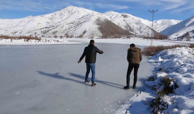 BİTLİS (İHA) – Bitlis’te son günlerde etkili olmaya başlayan dondurucu soğuk nedeniyle Güzeldere mendereslerine yakın bölgede irili ufaklı göletler donarken, bazı vatandaşlar ise donan göletlerin üzerinde halay çekerek keyifli dakikalar yaşadı.