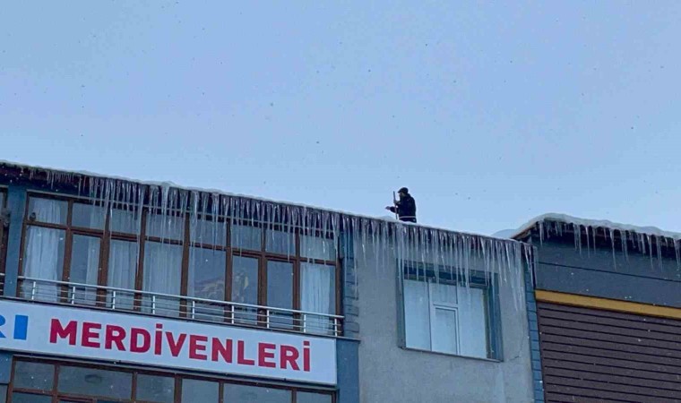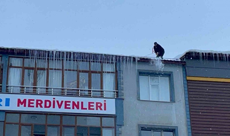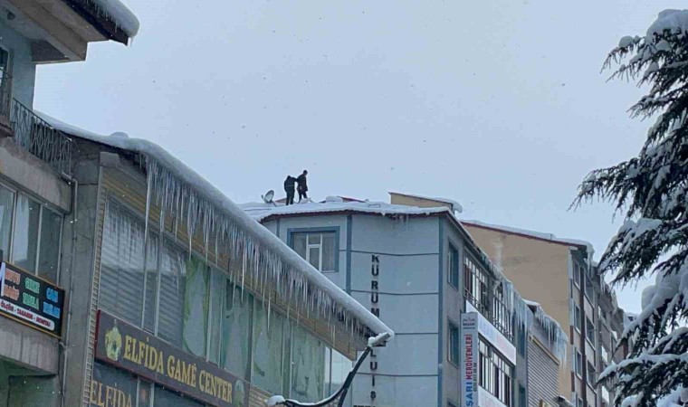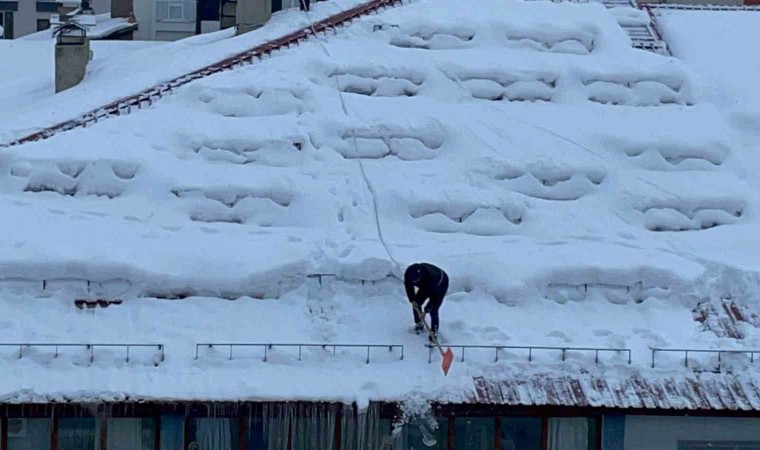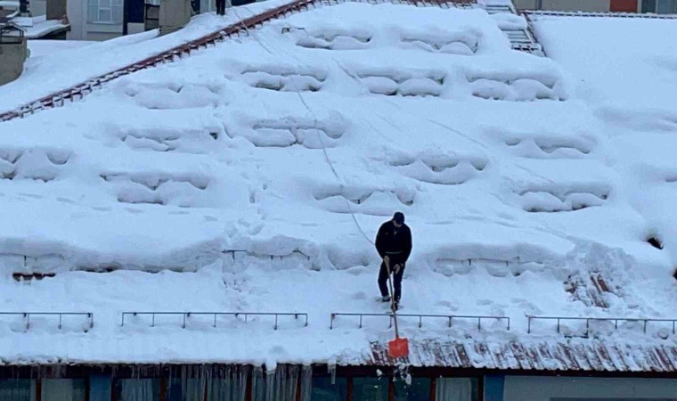 Tatvan ilçesinde son günlerde etkili olan kar yağışı hayatı olumsuz etkilemeye devam ediyor. Olumsuz hava şartlarından dolayı çatılarda biriken kar ve buz sarkıtlarını temizlemek isteyen 2 vatandaş, 5 katlı binanın üzerine çıktı. Beline bağlı ip ile çatıda kar temizliği yapmaya çalışan ve diğer vatandaşın ise onu iple tuttuğu anlara ilişkin görüntüler yürekleri ağızlara getirdi. Şahıslar uzun bir süre çatıda kar temizliğine devam ederken, çevredeki vatandaşlar ise korkulu gözlerle onları izledi.