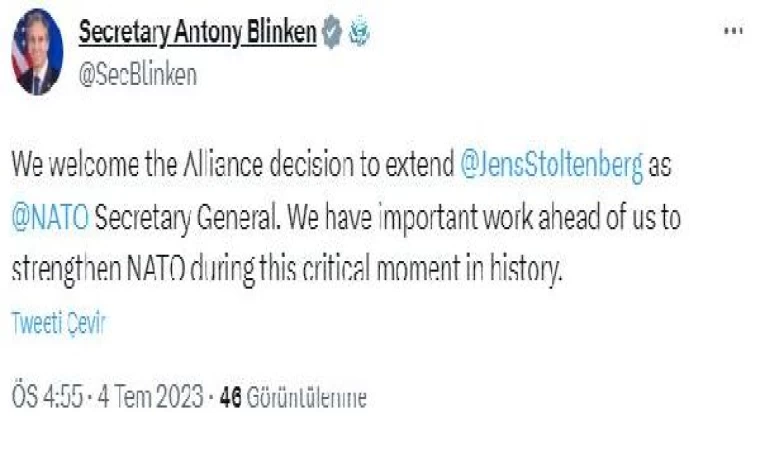 ABD Dışişleri Bakanı Antony Blinken, NATO Genel Sekreteri Jens Stoltenberg'in görev süresinin 1 yıl daha uzatılmasını memnuniyetle karşıladıklarını belirtti. Blinken, bu kararın NATO'yu güçlendirmek için önemli çalışmaların önlerinde olduğu bu kritik dönemde alındığını vurguladı.