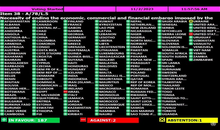 Birleşmiş Milletler (BM) Genel Kurulu’nda yapılan oylamada, ABD’nin Küba’ya yönelik ambargosunu sonlandırması talep edilen karar 2’ye karşı 187 oyla kabul edildi.