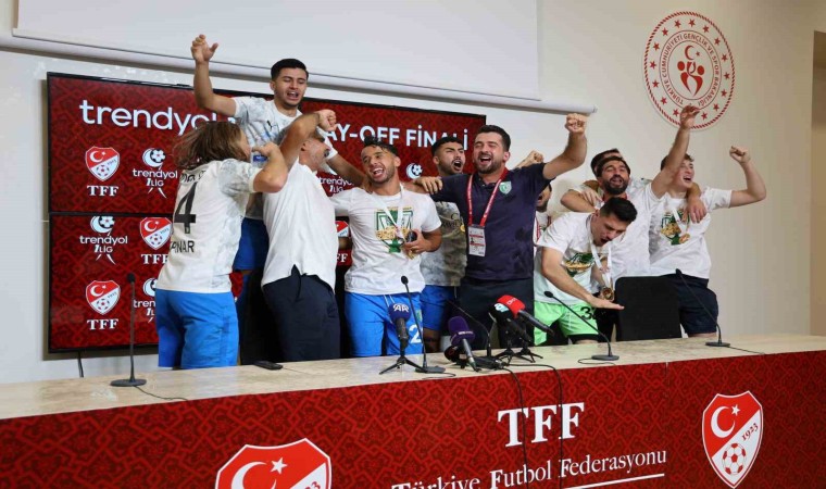 Bodrum FK futbolcuları kupa ile basın toplantısına girerek, Teknik Direktör İsmet Taşdemir’i ıslatıp Süper Lig’e yükselmelerini kutladı.