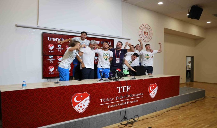 Bodrum FK oyuncuları kupa ile basın toplantısını basıp Teknik Direktör İsmet Taşdemir’i ıslatıp Süper Lig’e yükselmelerini kutladı.