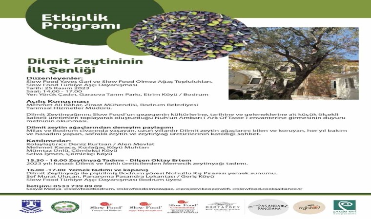 Bodrum ve Milas orijinine sahip Dilmit zeytini, Slow Food Türkiye ağından Slow Food Yaveş Gari Bodrum ve Slow Food Ölmez Ağaç Edremit topluluklarının ortak çalışmasıyla Ekim 2023’te uluslararası Nuh’un Ambarı listesine eklendi.