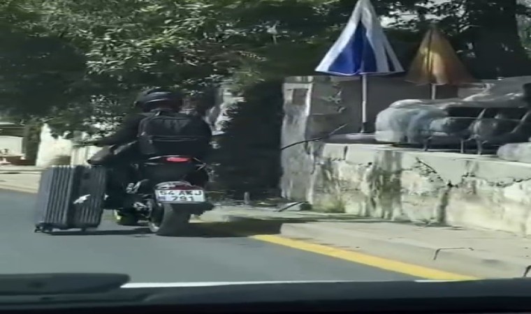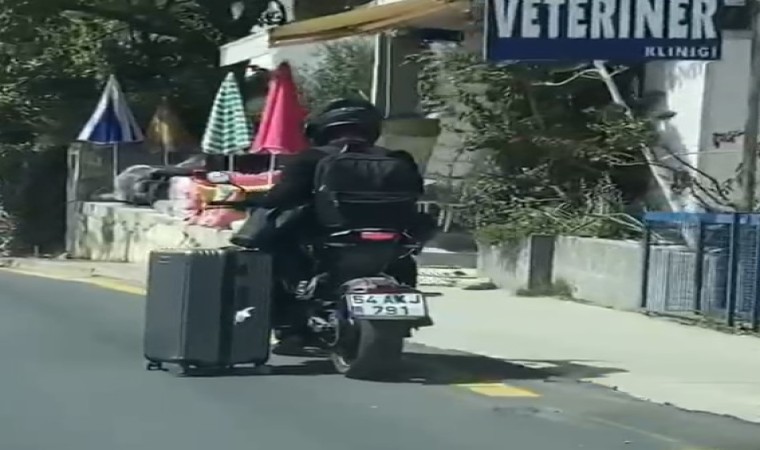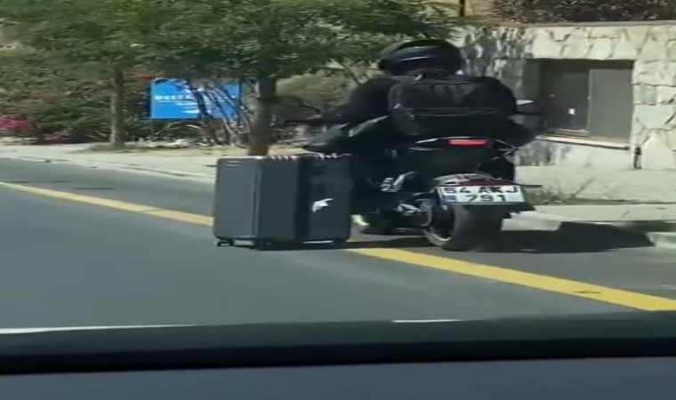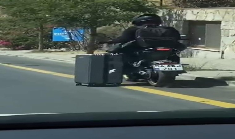 Muğla’nın Bodrum ilçesinde motosikletiyle seyreden sürücünün, bir yandan da valizini eliyle çekerek götürmesi, vatandaşlar tarafından cep telefonu kamerası ile görüntülendi.