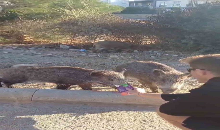 Bodrum’un Çırkan Mahallesi’nde yaban domuzlarının yiyecek aradığını gören Mustafa Akman ve arkadaşı İrem Çevikel, harekete geçti. Domuzların yaklaşmasını bekleyen iki arkadaş, yanlarında getirdikleri yaş mamayı hayvanlara verdi. Akman ve Çevikel o anları cep telefonlarıyla kaydederken, domuzların mamayı yemesi görenleri şaşırttı.
