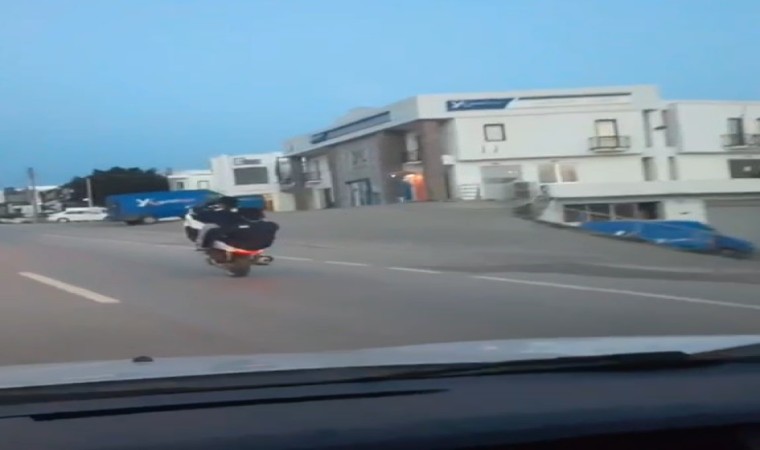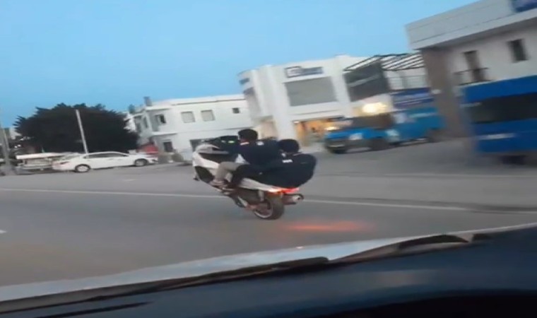 Muğla’nın Bodrum ilçesinde motosikletin önünü kaldırarak seyreden gençlerin canlarını tehlikeye attığı anlar, saniye saniye görüntülendi.