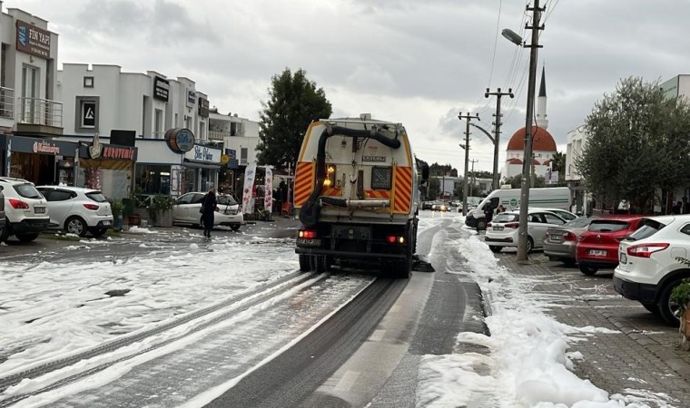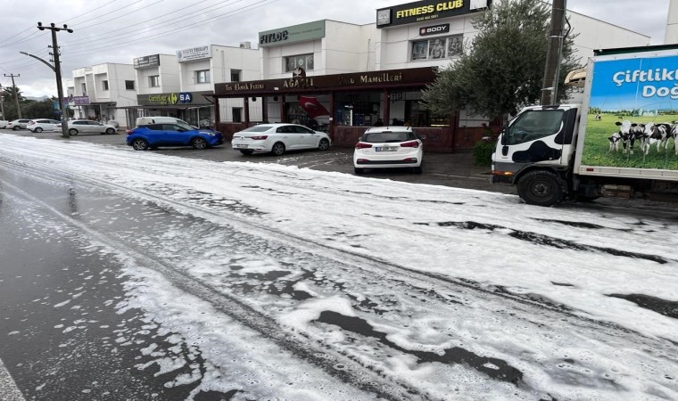 Muğla’nın Bodrum ilçesinde yağmur sonrası yolda yoğun bir köpük tabakası oluştu. Bir araçtan yola dökülen deterjandan kaynaklandığı tahmin edilen köpük, belediye ekiplerince temizlendi.