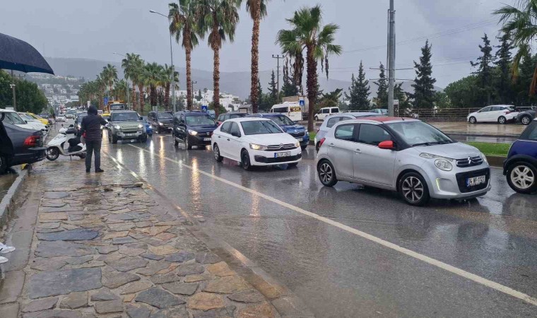 Bodrum’da bugün sağanak yağış etkili oldu. Özellikle ilçenin merkezi bölgelerinde kuvvetli şekilde yağan yağmur, günlük yaşamı olumsuz şekilde etkiledi. Yağış anında göle dönen Kıbrıs Şehitleri Caddesi araç trafiğine kapandı. Bodrum Belediyesi ekipleri, çöplerle tıkanan mazgallarda yağış boyunca çalışma yaptı. Yoldaki suyun azalmasıyla cadde yeniden trafiğe açıldı. İlçe merkezindeki bazı sokak ve caddeler de yağış esnasında dereye döndü, araçlar caddelerde güçlükle ilerledi. Belediye ekiplerince sorun olan bölgelerde çalışmalar yürütülüyor.
