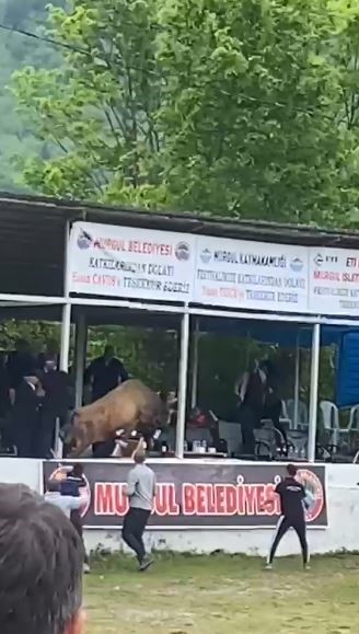 ARTVİN’İN MURGUL İLÇESİNDE DÜZENLENEN BOĞA GÜREŞLERİNDE RAKİBİNİ BEKLEYEN BOĞA PROTOKOL TRİBÜNÜNE DALDI. İLGİNÇ GÖRÜNTÜLERİN YAŞANDIĞI OLAYDA BİR KİŞİ YARALANDI.